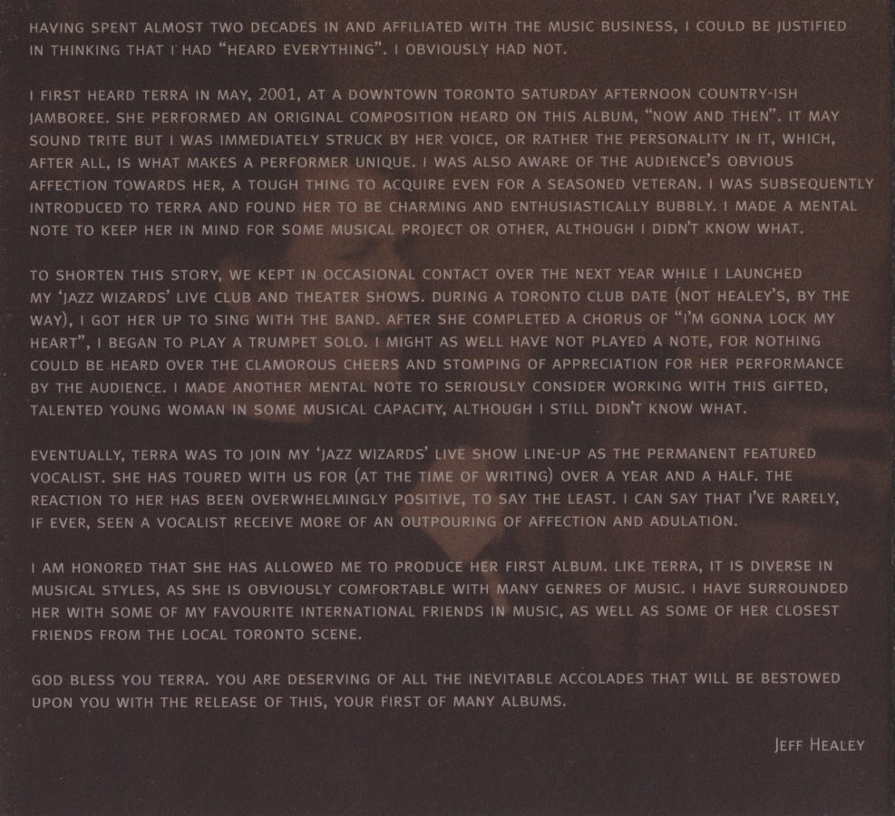ALEC FRASER Bass, TERRA HAZELTON Vocals, JEFF HEALEY Guitar, DAVE MURPHY Piano, CHRISTOPHER PLOCK Saxophone, AL WEBSTER Drums