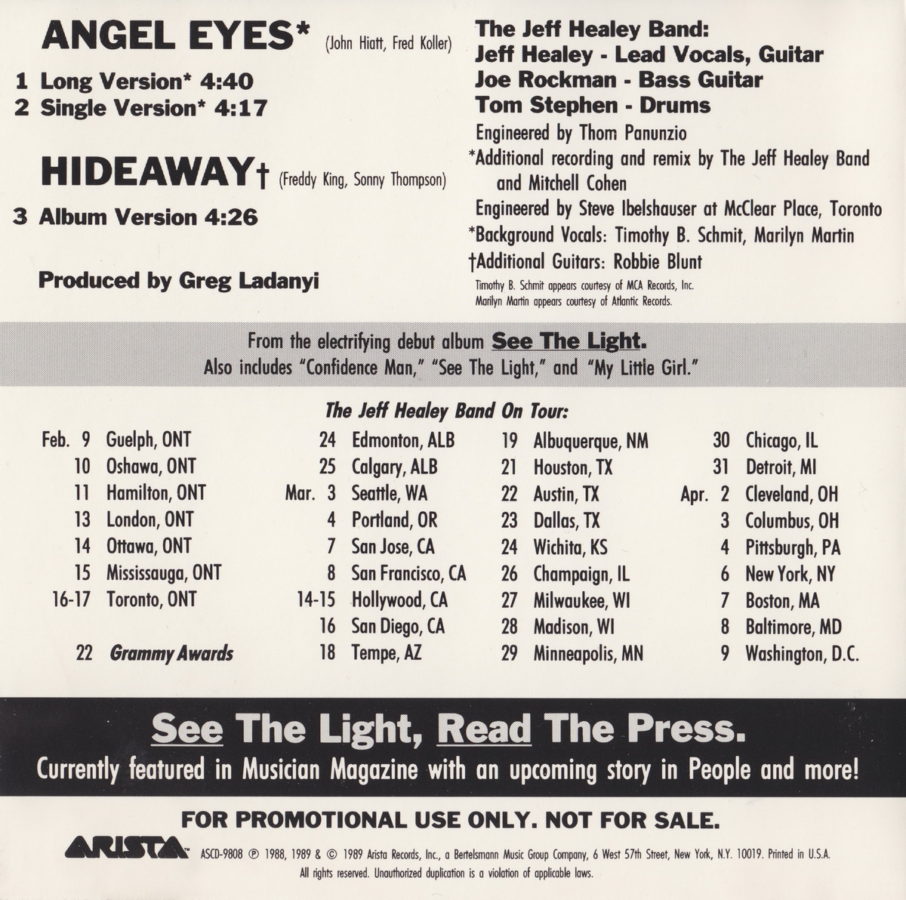 Another John Hiatt song, the top 5 hit, 'Angel Eyes', remains one of the Jeff Healey Band's most recognizable songs to this day. This promo version contains a different mix of the song than found on the 'See The Light' album.