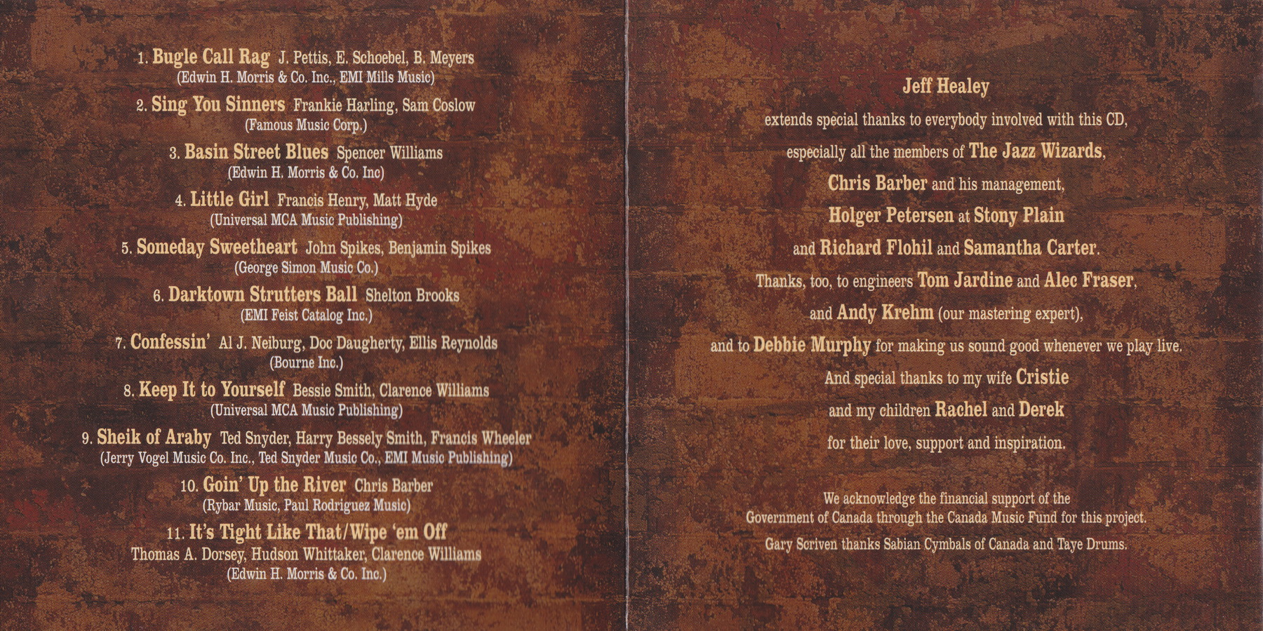 JESSE BARKSDALE Guitar, COLIN BRAY Bass, JEFF HEALEY Trumpet/Guitar/Vocal, DREW JURECKA Violin, REID KAISER Piano, ROSS WOLDRIDGE Clarinet, GARY SCRIVEN Washboard