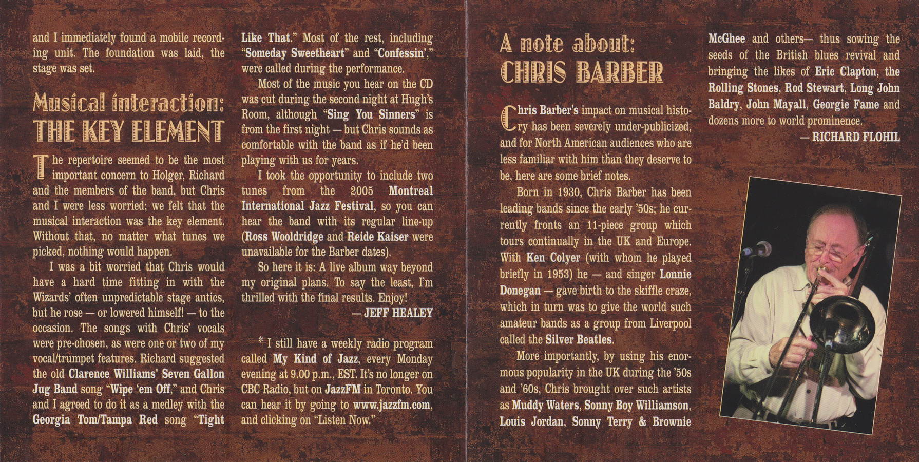 CHRIS BARBER Trombone/Vocal, JESSE BARKSDALE Guitar, COLIN BRAY Bass, BRIAN GRAVILLE Piano, JEFF HEALEY Trumpet/Guitar, DREW JURECKA Violin, CHRISTOPHER PLOCK Saxophones, GARY SCRIVEN Drums