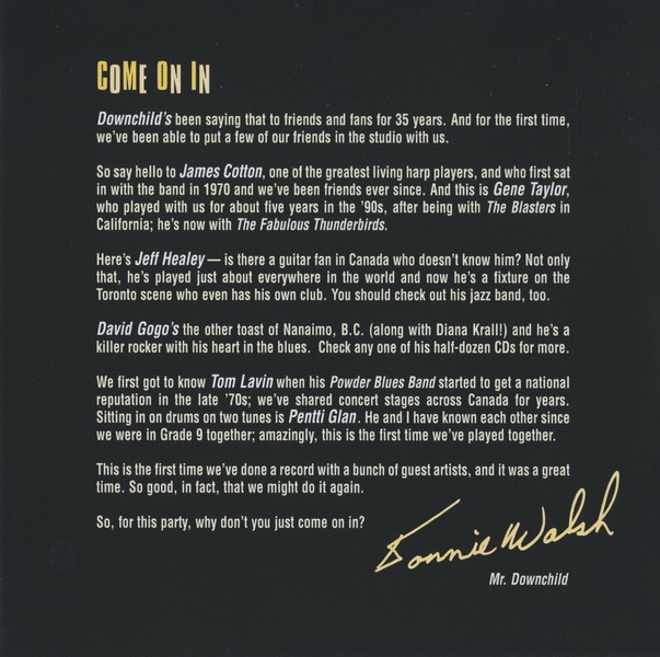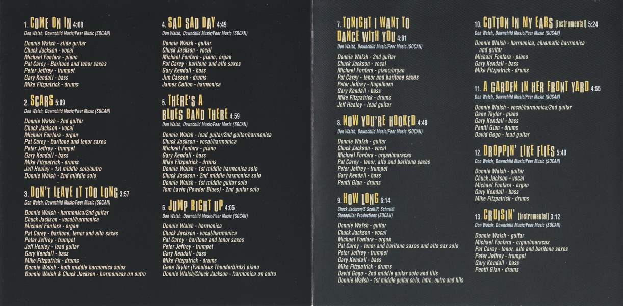 DONNIE WALSH Harminica/2nd Guitar, CHUCK JACKSON Vocal/Harmonica, MICHAEL FONFARA Organ, PAT CAREY Baritone, Tenor & Alto Saxes, PETER JEFFREY Trumpet, GARY KENDALL Bass, MIKE FITZPATRICK Drums, JEFF HEALEY Lead Guitar, DONNIE WALSH Both Harmonica Solos, DONNIE WALSH & CHUCK JACKSON Harmonicas on Outro